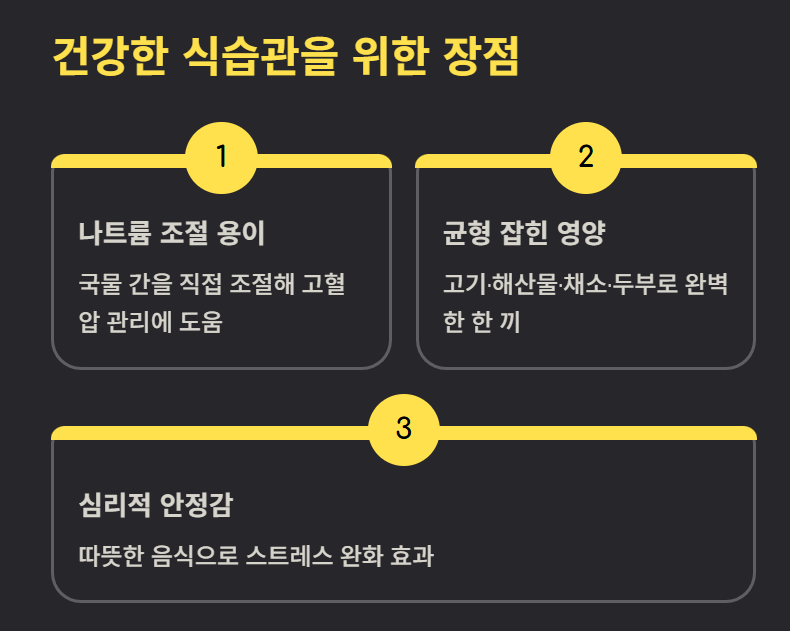 국물 맛을 직접 조절할 수 있어 짜게 먹지 않아도 됩니다. 간장, 폰즈, 참깨소스 등을 적당히 활용하면 나트륨 섭취를 줄이면서도 맛있게 즐길 수 있어 고혈압 관리에도 도움이 됩니다.