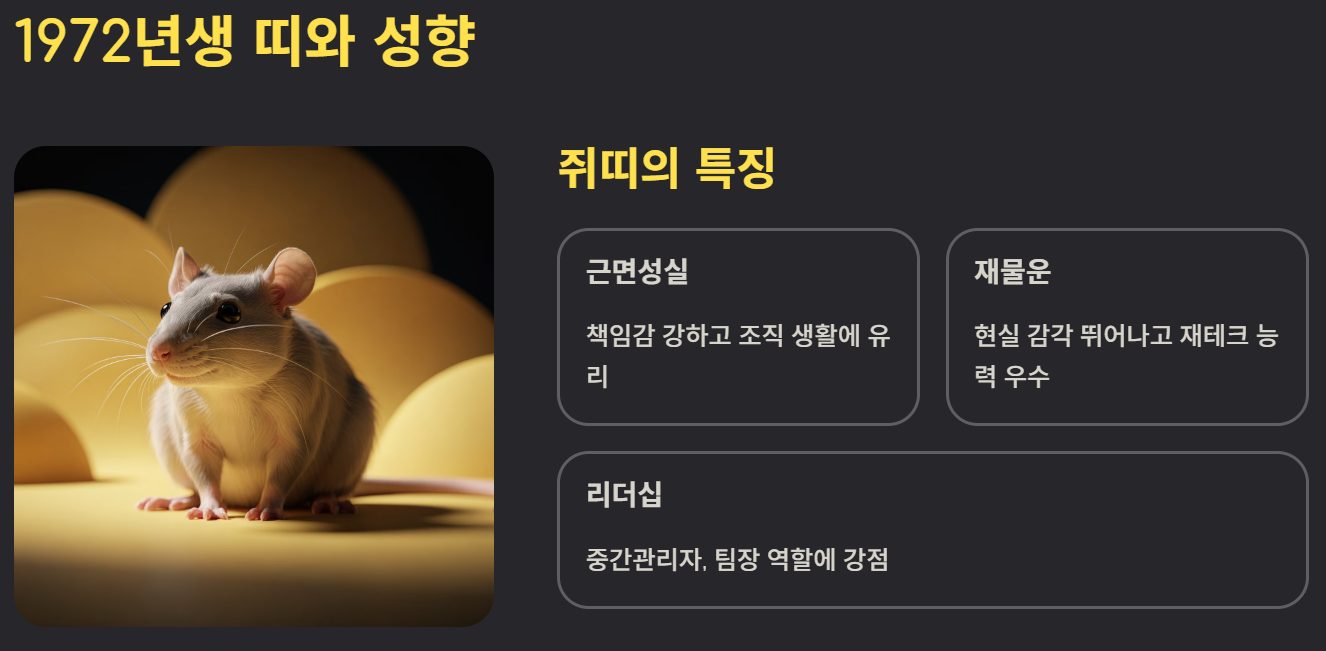 1972년생은 쥐띠입니다. 쥐띠는 근면성실, 현실 감각이 뛰어나고 재물 운이 좋은 편으로 알려져 있습니다. 조직 생활에 강하고 책임감이 강해 중간관리자, 리더 역할을 맡는 경우가 많습니다.