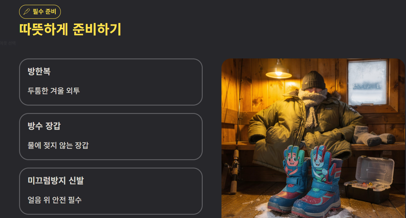 양평 빙어축제 알아보기에서 빼놓을 수 없는 부분이 바로 복장입니다. 방한복, 방수 장갑, 미끄럼 방지 신발은 필수이며, 핫팩을 준비하면 장시간 체험에도 도움이 됩니다.