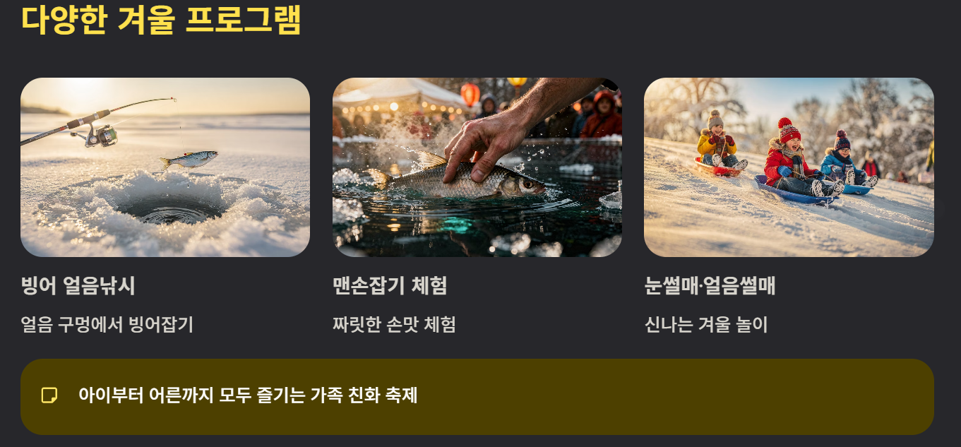 양평 빙어축제는 겨울철 결빙된 호수나 강에서 빙어낚기를 체험할 수 있는 겨울 대표 축제입니다. 수도권에서 접근성이 좋아 당일치기 여행으로도 인기가 높으며, 매년 겨울철 수많은 관광객이 방문합니다.