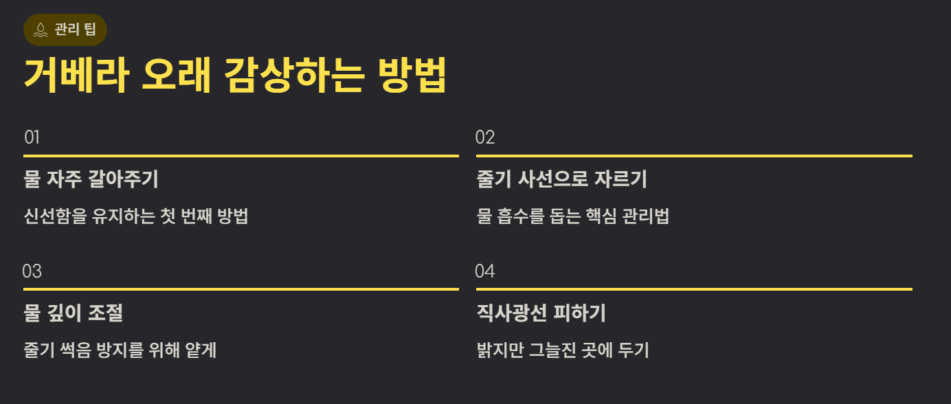 거베라를 오래 보려면 물을 자주 갈아주고 줄기 끝을 사선으로 잘라주는 것이 좋습니다. 물은 깊지 않게 유지해 줄기 썩음을 방지해야 하며, 직사광선은 피하는 것이 좋습니다.