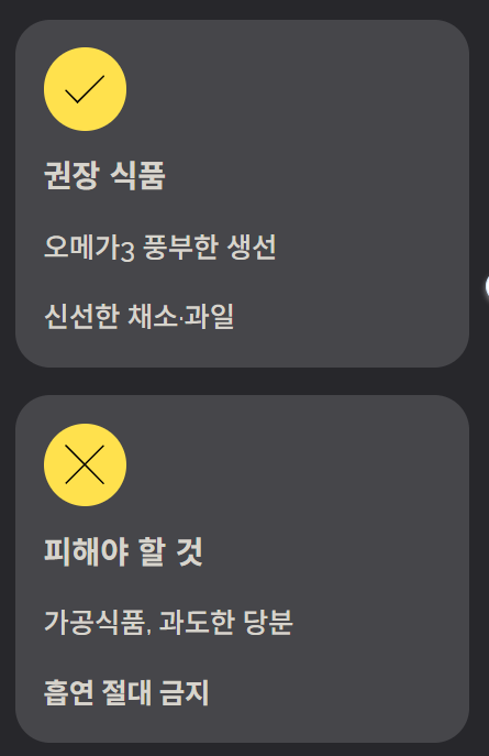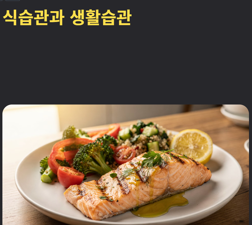항염 효과가 있는 식단을 유지하는 것이 좋습니다. 가공식품, 과도한 당분 섭취는 피하고, 오메가3가 풍부한 생선, 채소 위주의 식단을 권장합니다. 흡연은 증상을 악화시킬 수 있어 반드시 피해야 합니다.