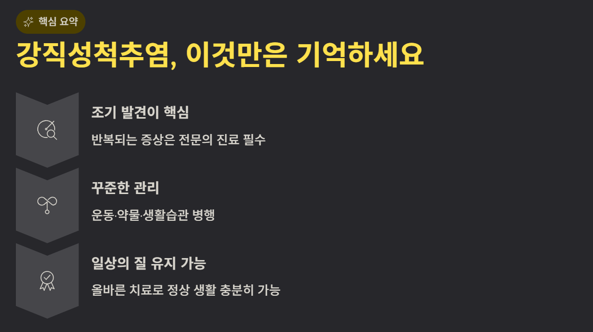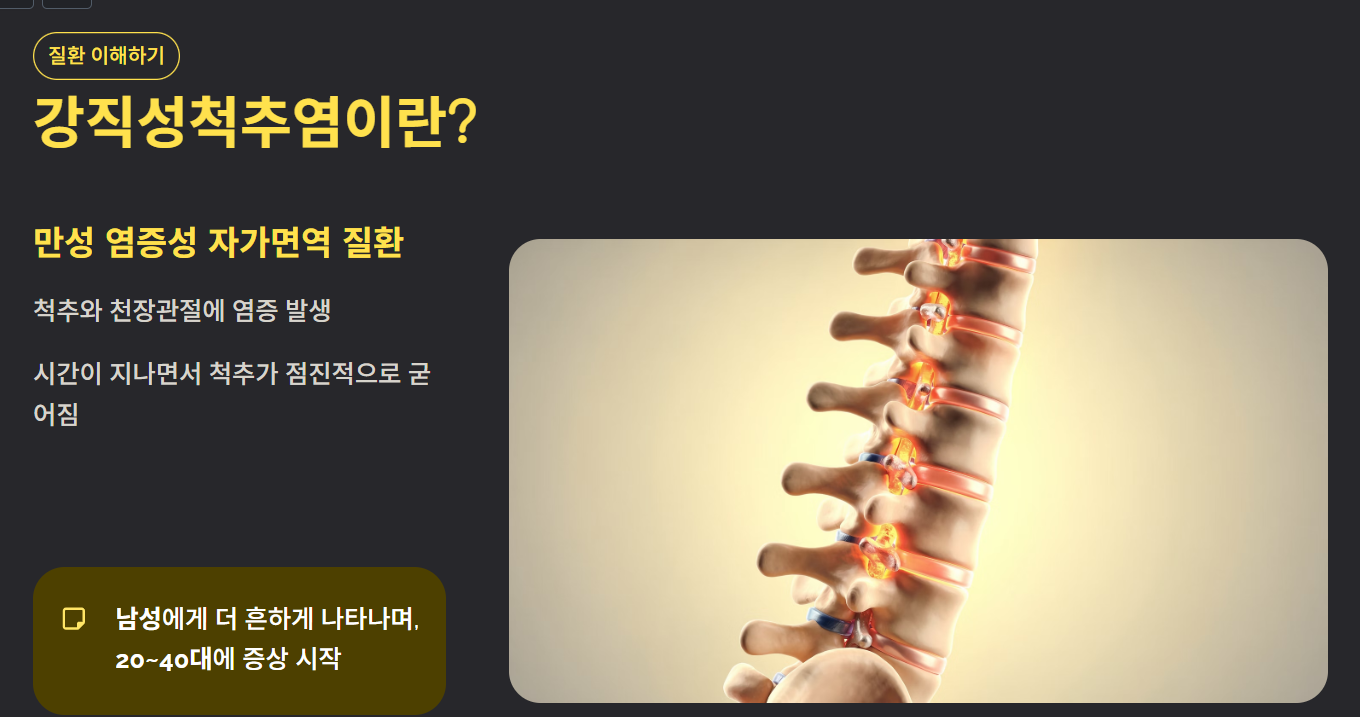 강직성척추염은 조기 발견과 꾸준한 관리가 무엇보다 중요한 질환입니다. 단순 허리 통증으로 방치하지 말고, 증상이 반복된다면 전문의 진료를 받아보는 것이 필요합니다. 올바른 치료와 생활 관리만 잘 병행해도 일상생활의 질을 충분히 지킬 수 있습니다.