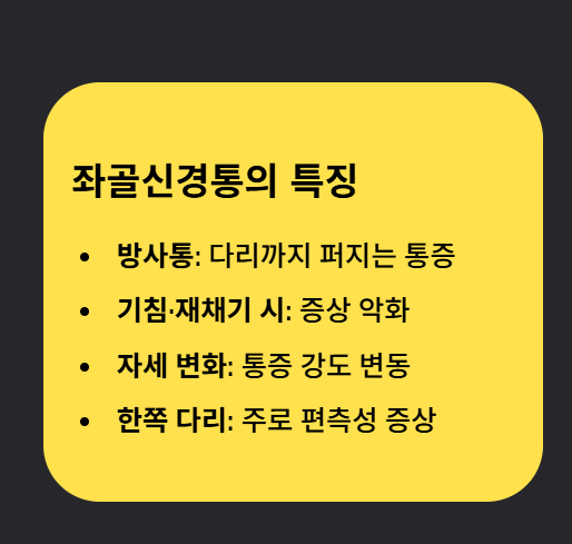 일반적인 허리 통증은 국소 부위에 머무는 경우가 많지만 좌골신경통은 다리까지 통증이 퍼지는 방사통이 특징입니다. 또한 기침이나 재채기를 할 때 통증이 심해지는 경우도 좌골신경통의 전형적인 증상 중 하나입니다.