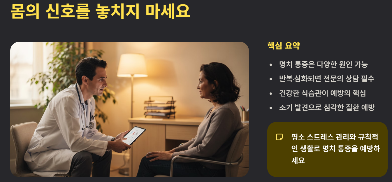 명치 통증은 가볍게 넘길 증상이 아니며, 원인에 따라 적절한 관리가 필요합니다. 단순 소화 문제부터 심각한 질환까지 다양한 가능성이 있으므로 통증이 반복되거나 심해진다면 반드시 전문의 상담을 받아야 합니다. 평소 건강한 식습관과 스트레스 관리를 통해 명치 통증을 예방하고, 몸의 신호를 놓치지 않는 것이 중요합니다.