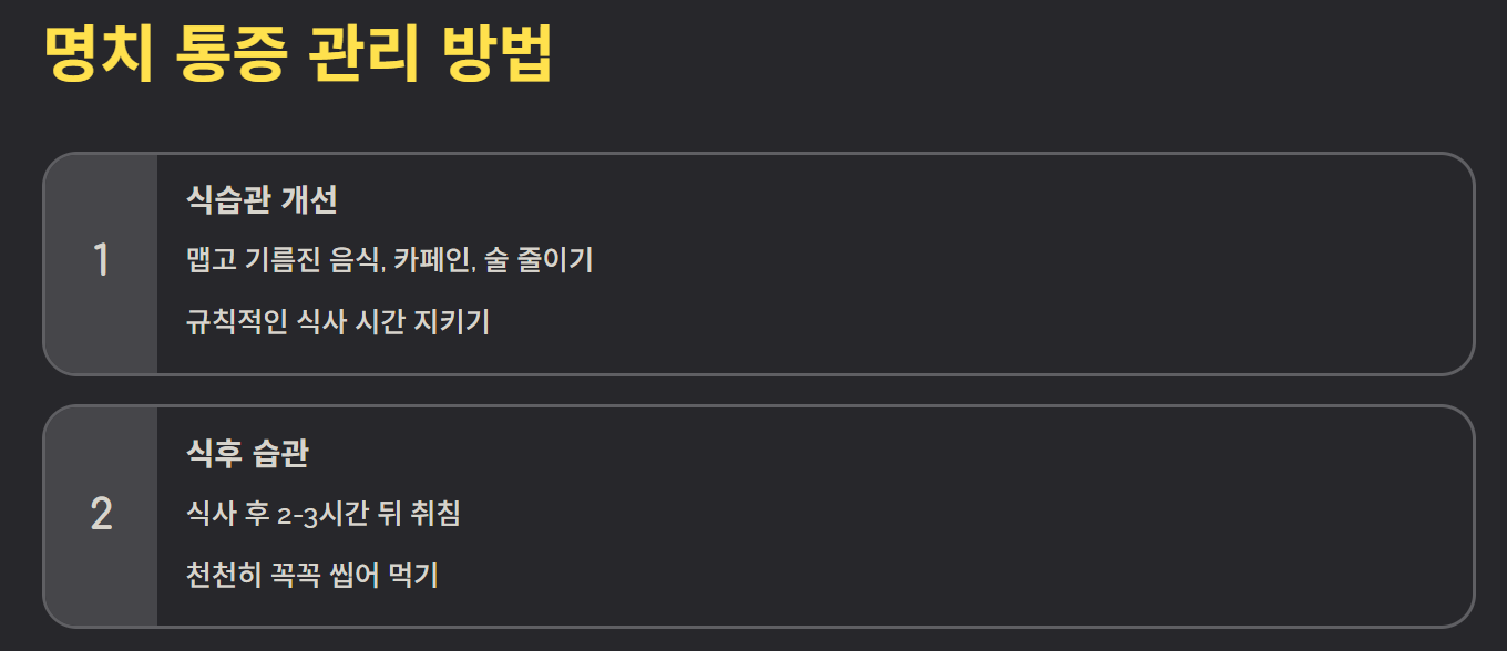 명치 통증 완화를 위해서는 식습관 개선이 핵심입니다. 맵고 기름진 음식, 카페인, 술을 줄이고 규칙적인 식사를 유지해야 합니다. 식후 바로 눕지 않고, 스트레스 관리와 충분한 수면도 중요합니다. 필요 시 위장약이나 제산제 복용이 도움이 될 수 있습니다.