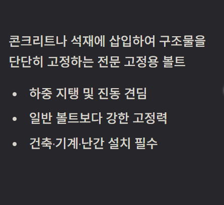 앙카볼트는 콘크리트나 석재에 삽입하여 구조물, 기계, 난간 등을 고정하는 고정용 볼트입니다. 주로 하중을 지탱하거나 진동을 견뎌야 하는 곳에 사용되며, 일반 볼트보다 훨씬 강한 고정력을 제공합니다.