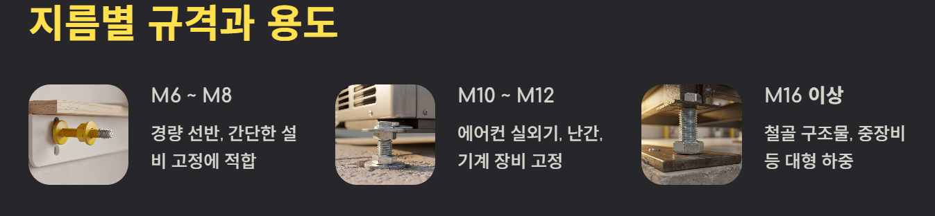 이 규격 선택이 잘못되면 고정력이 약해지거나 콘크리트 파손 위험이 있습니다.