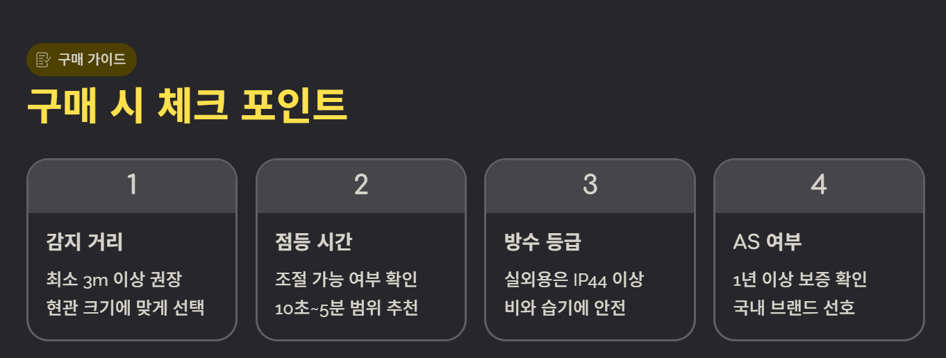 구매 전 감지 거리, 점등 시간 조절 가능 여부, 방수 등급(IP 등급), AS 여부를 확인해야 한다. 공동주택 현관이라면 소음 없는 제품을 선택하는 것이 좋으며, 디자인도 집 분위기와 어울리는지 고려해야 한다.
