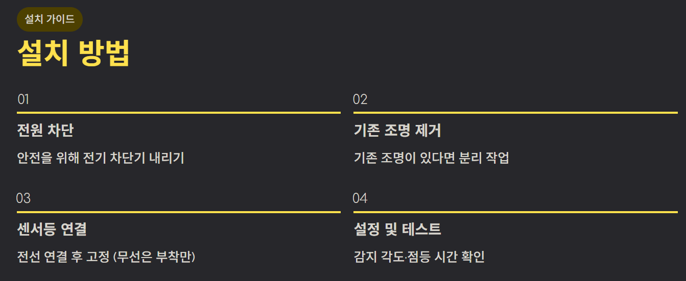 기존 조명이 있는 경우 전원을 차단한 뒤 센서등으로 교체하면 된다. 무선 제품은 양면테이프나 자석으로 부착만 하면 되며, 전기 공사가 필요 없어 초보자도 쉽게 설치할 수 있다. 설치 후에는 감지 각도와 점등 시간을 꼭 테스트해야 한다.