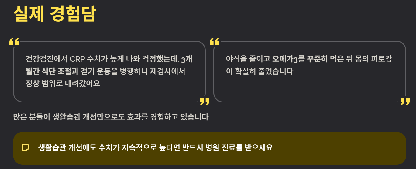 “건강검진에서 CRP 수치가 높게 나와 걱정했는데, 3개월간 식단 조절과 걷기 운동을 병행하니 재검사에서 정상 범위로 내려갔어요.”