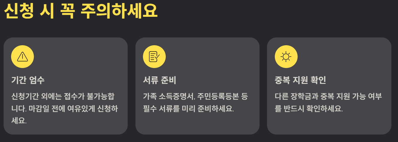 - 중복 지원 불가: 다른 장학금과 중복 지원 여부 확인