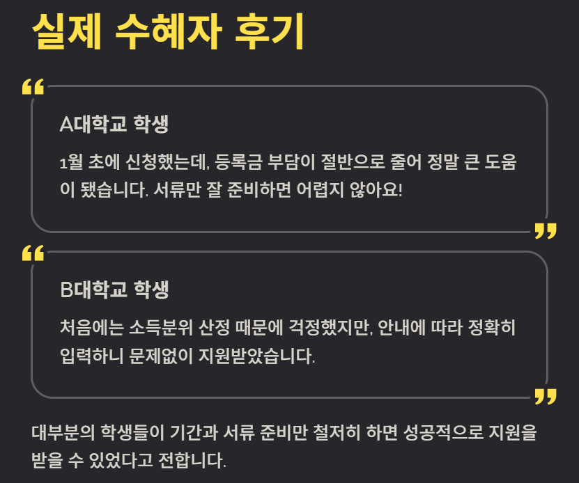 - A대 학생: “1월 초에 신청했는데, 등록금 부담이 절반으로 줄어 정말 큰 도움이 됐습니다.”