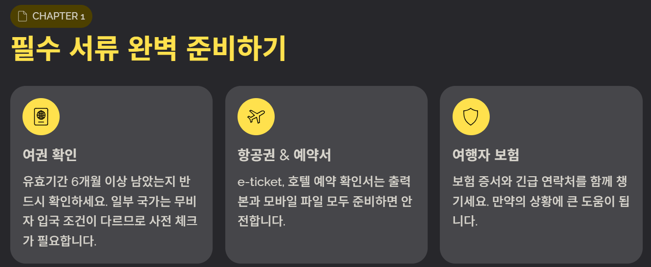실제 여행자들의 후기를 보면 “멀티 어댑터를 안 챙겨서 불편했다”, “상비약 덕분에 여행 내내 컨디션이 좋았다”는 의견이 많습니다. 특히 여권 사본과 카드 분산 보관은 분실 상황에서 큰 도움이 되었다는 후기가 많아 필수로 추천됩니다.