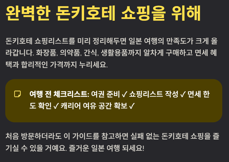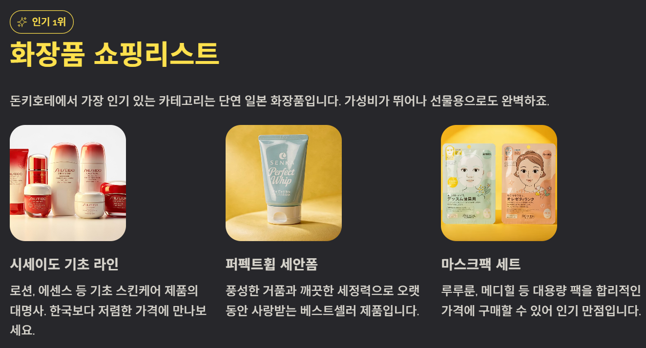 돈키호테 쇼핑리스트를 미리 정리해두면 일본 여행의 만족도가 크게 올라갑니다. 화장품, 의약품, 간식, 생활용품까지 알차게 구매할 수 있으며, 면세 혜택과 합리적인 가격까지 누릴 수 있습니다. 처음 방문하더라도 이 가이드를 참고하면 실패 없는 돈키호테 쇼핑을 즐기실 수 있을 거예요.