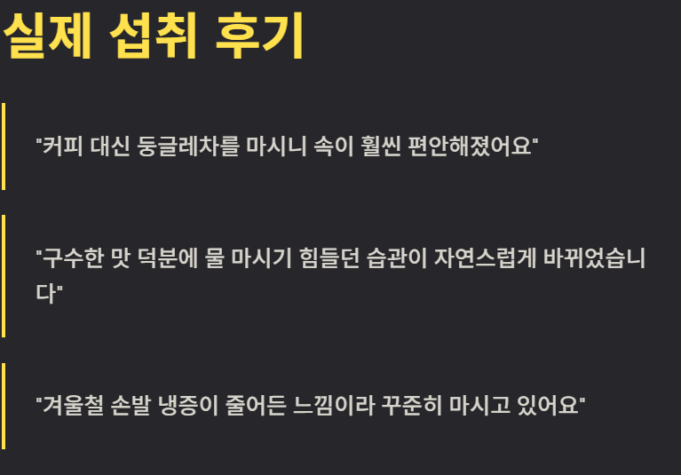 이처럼 둥글레차 후기는 전반적으로 부담 없고 지속하기 좋다는 평가가 많습니다.