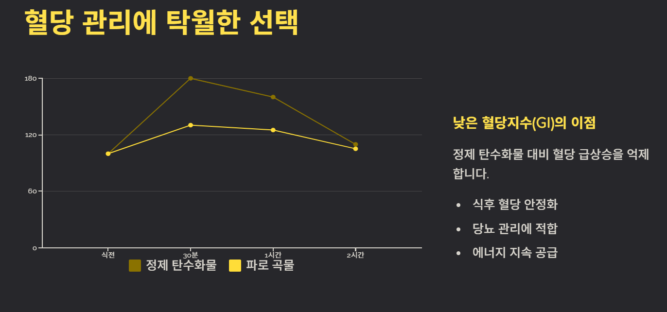 파로는 정제 탄수화물보다 혈당 지수(GI)가 낮아 식후 혈당 급상승을 억제하는 데 도움이 됩니다.