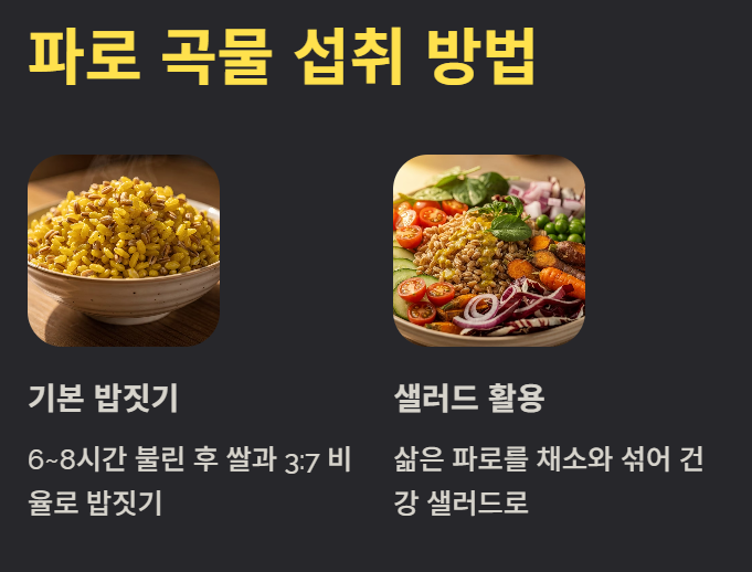 - 샐러드 활용: 삶은 파로를 채소와 섞어 샐러드로 섭취