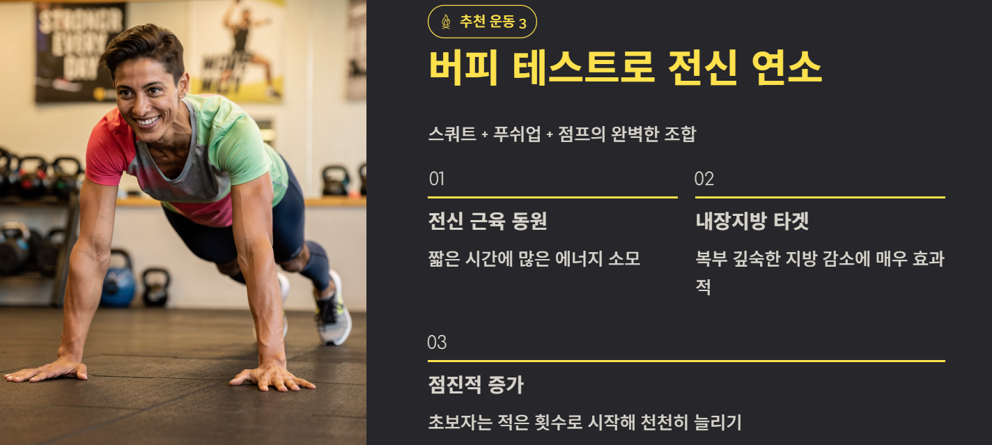버피 테스트는 스쿼트, 푸쉬업, 점프를 결합한 고강도 운동입니다. 전신 근육을 사용해 짧은 시간에 많은 에너지를 소모하며, 내장지방 감소에 매우 효과적입니다. 초보자는 횟수를 줄여 점진적으로 늘리는 것이 좋습니다.