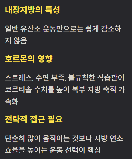 복부에는 내장지방이 많아 일반적인 유산소 운동만으로는 쉽게 줄지 않습니다. 스트레스, 수면 부족, 불규칙한 식습관은 코르티솔 수치를 높여 뱃살 축적을 가속화합니다. 따라서 단순히 많이 움직이는 것보다 지방 연소 효율을 높이는 운동 선택이 중요합니다.