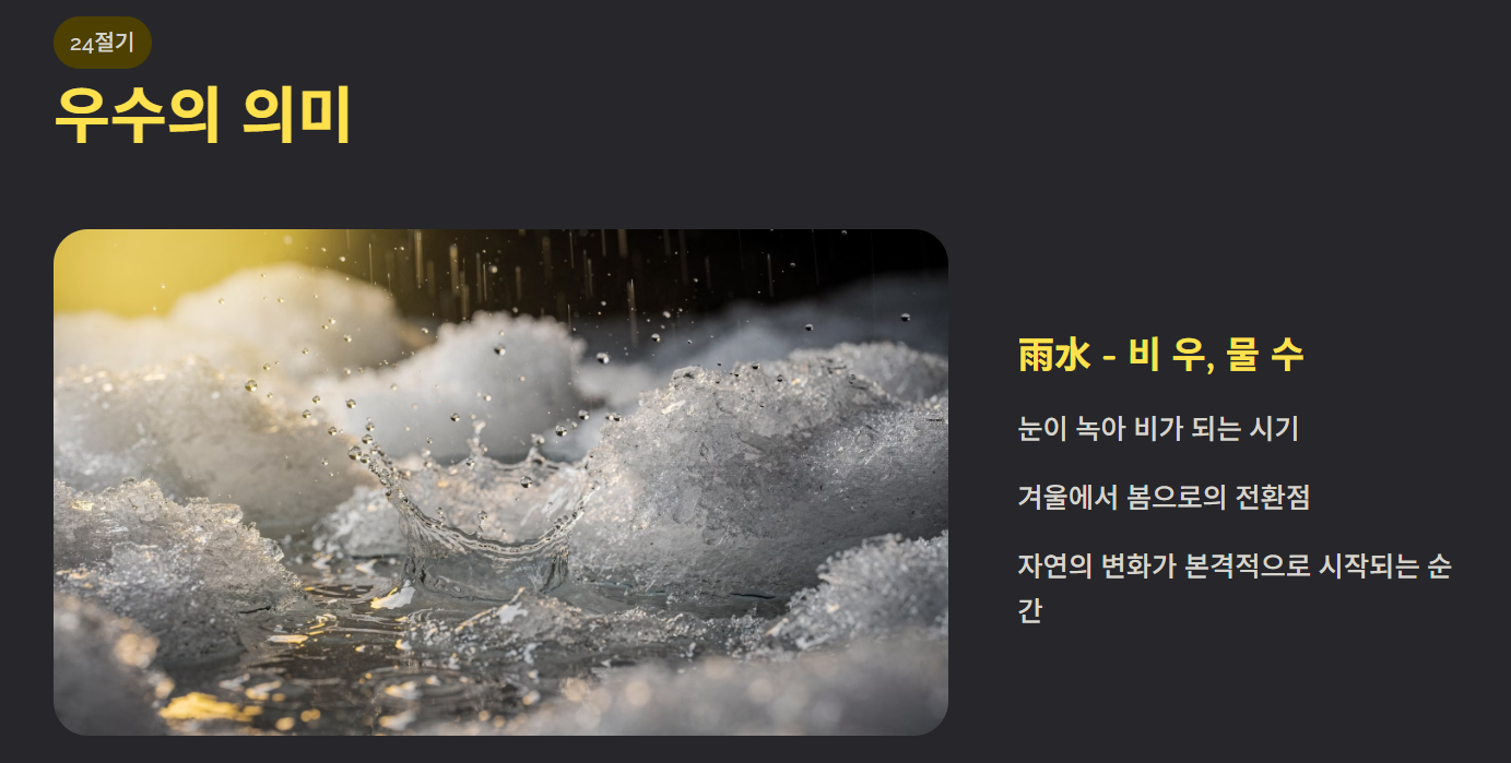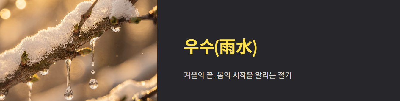 우수는 한자로 ‘비 우(雨)’, ‘물 수(水)’를 사용하며 눈이 녹아 비가 된다는 뜻입니다. 겨울에서 봄으로 넘어가는 전환점으로 여겨지며 자연의 변화가 본격적으로 시작되는 시기입니다.