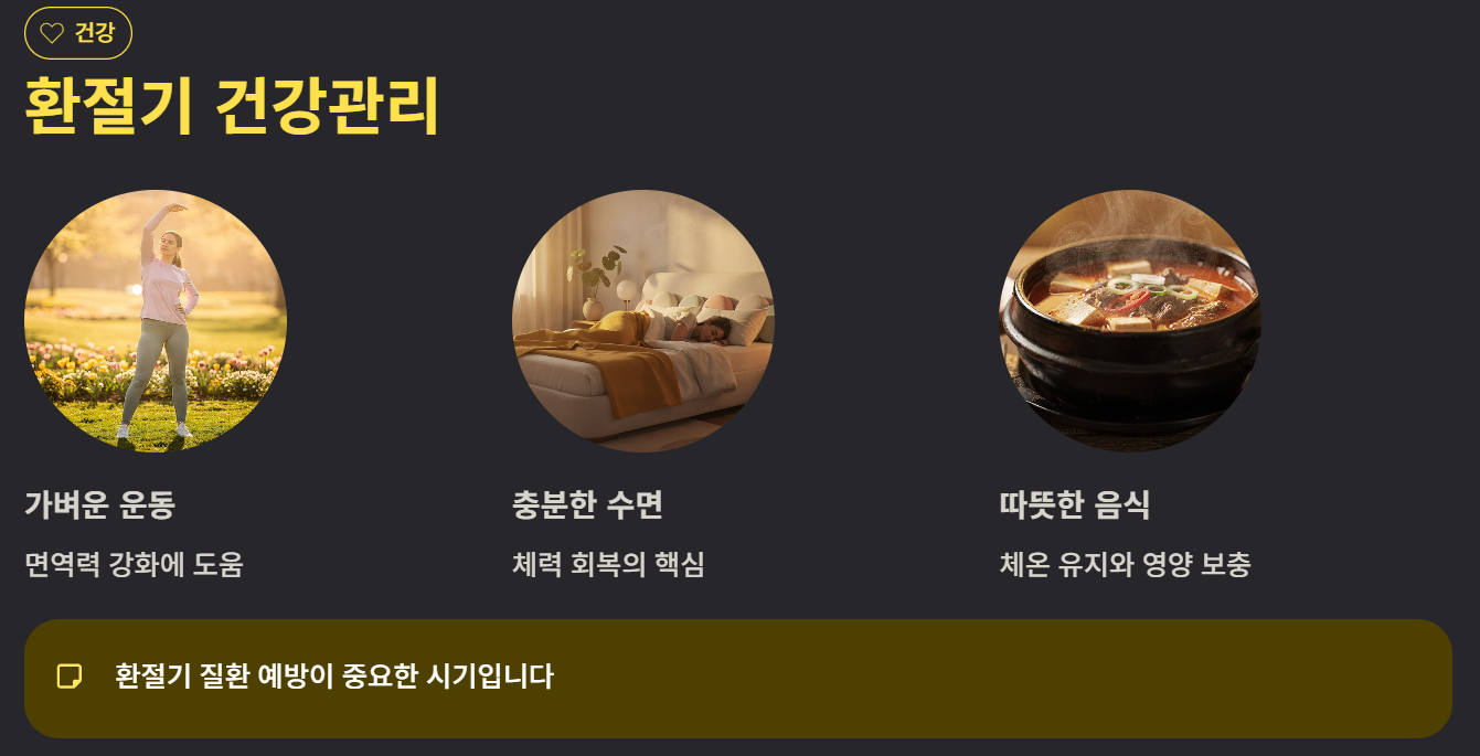 환절기 질환이 늘어나는 시기이므로 면역력 관리가 중요합니다. 가벼운 운동, 충분한 수면, 따뜻한 음식 섭취가 도움이 됩니다.