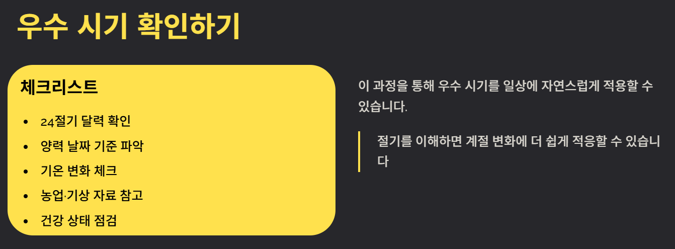 우수는 단순한 절기가 아니라 계절의 흐름과 생활 리듬을 조정하는 중요한 기준입니다. 기후 변화, 건강관리, 생활 계획에 활용하면 실질적인 도움이 됩니다. 특히 봄을 준비하는 전환점으로 삼는 것이 핵심입니다.