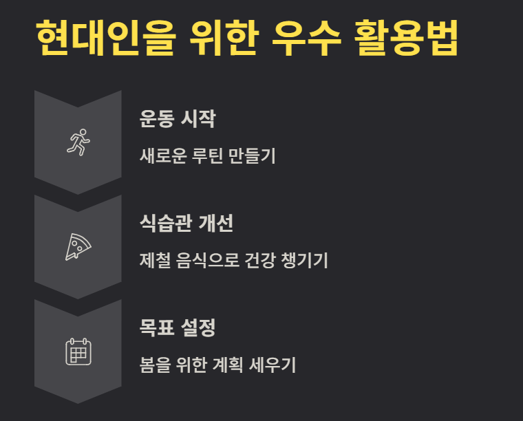 현대인에게 우수는 라이프스타일 리셋 시기로 활용할 수 있습니다. 운동 시작, 식습관 개선, 계획 세우기에 적합한 시기입니다.