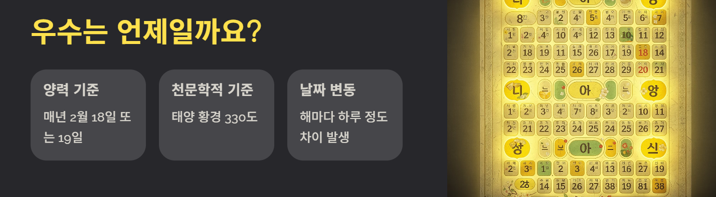 우수는 양력 기준으로 매년 2월 18일 또는 19일 전후에 해당합니다. 태양의 황경이 330도에 도달하는 시점을 기준으로 정해지기 때문에 해마다 하루 정도 차이가 발생할 수 있습니다.
