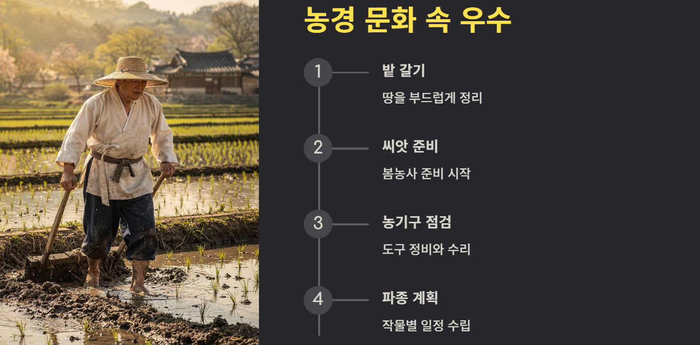 예로부터 우수 무렵에는 대청소, 농기구 점검, 봄맞이 준비를 했습니다. 이는 계절 변화에 맞춰 생활을 정비하기 위한 지혜였습니다.