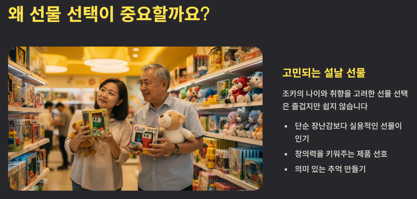 설날이 다가오면 조카 선물을 고민하는 부모님, 삼촌·이모님들이 많습니다. 조카의 나이와 취향에 맞는 선물을 고르는 일은 즐겁지만 쉽지 않은 일입니다. 요즘에는 단순한 장난감보다는 실용적이거나 창의력을 키워주는 선물이 인기를 얻고 있습니다.