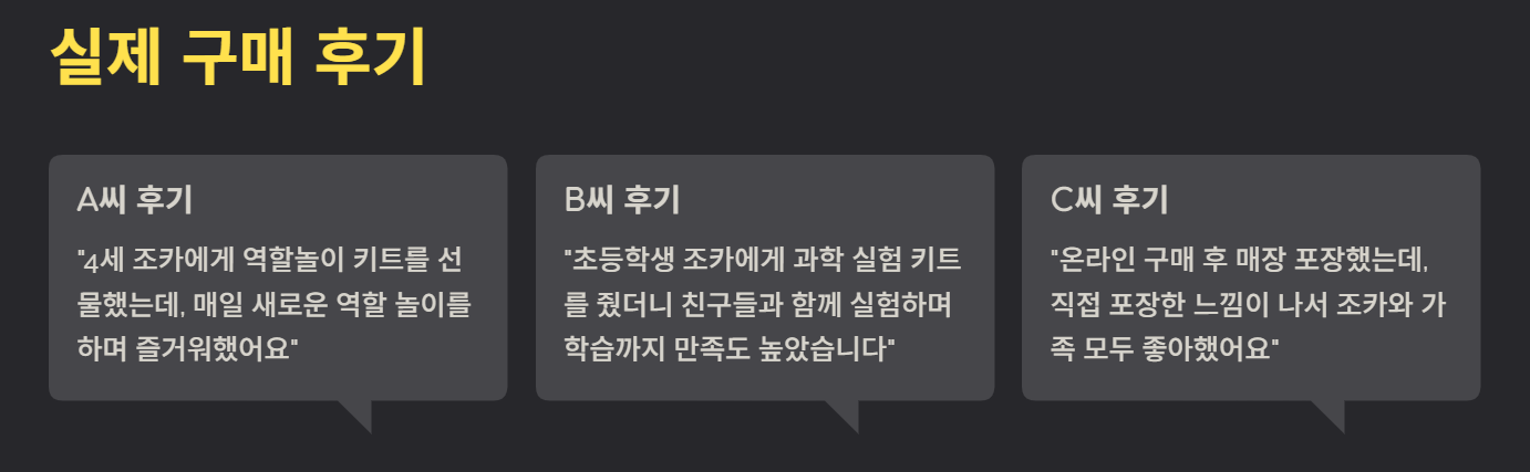 - B씨: “초등학생 조카에게 과학 실험 키트를 줬더니 친구들과 함께 실험하며 학습까지 할 수 있어 만족도가 높았습니다.”