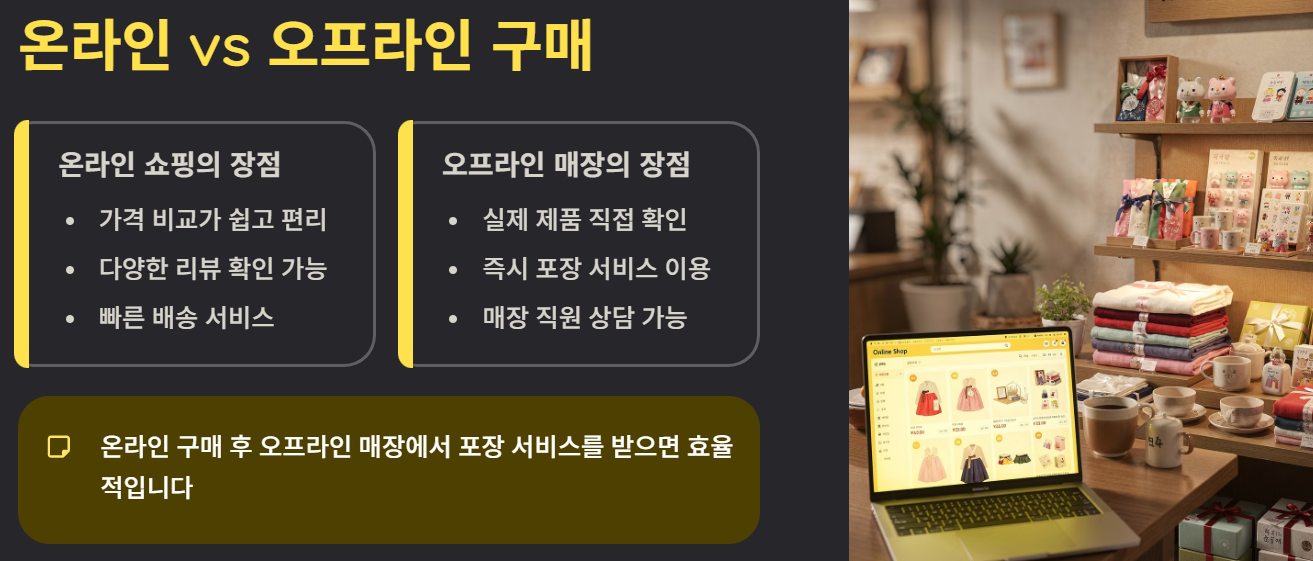 - 오프라인: 실제 제품 확인 가능, 포장 서비스 이용 가능.