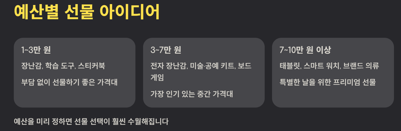- 중가(3~7만 원): 전자 장난감, 미술·공예 키트, 보드게임