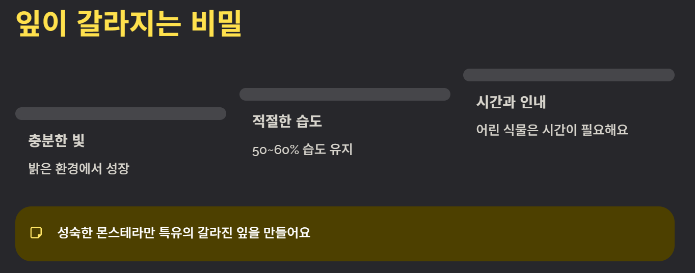 충분한 빛, 성장 환경, 일정한 습도가 맞춰지면 잎이 자연스럽게 갈라집니다. 어린 식물은 갈라지지 않는 것이 정상입니다.