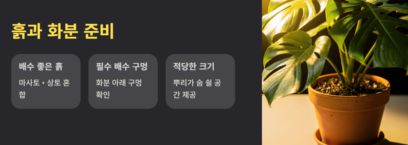 배수가 좋은 흙을 사용해야 뿌리 썩음을 방지할 수 있습니다. 마사토와 상토를 섞은 토양이 적합하며 화분 아래 배수 구멍은 필수입니다.