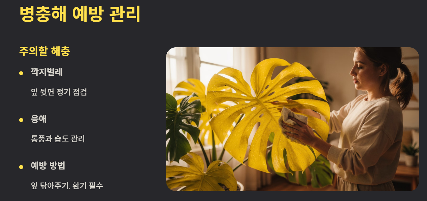 깍지벌레나 응애가 생길 수 있으므로 잎을 주기적으로 닦아주고 통풍을 유지해야 합니다. 이상 징후 발견 시 바로 제거하는 것이 중요합니다.