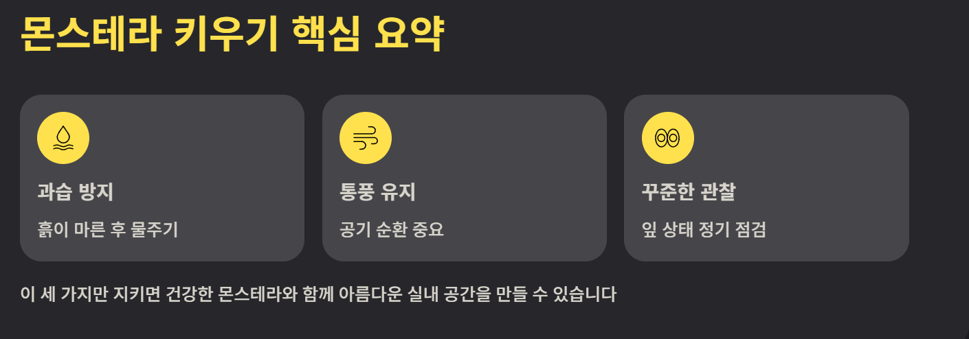 몬스테라는 초보자도 쉽게 키울 수 있는 대표적인 실내 식물로, 밝은 간접광과 적절한 물 관리만 유지하면 건강하게 성장합니다. 몬스테라 키우기의 핵심은 과습 방지, 통풍 유지, 꾸준한 관찰입니다. 관리 방법만 잘 지키면 공기정화와 인테리어 효과를 동시에 얻을 수 있는 매력적인 식물입니다.