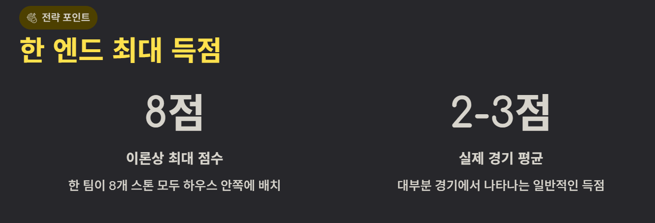 이론적으로 한 엔드에서 얻을 수 있는 최대 점수는 8점입니다. 하지만 실제 경기에서는 2~3점이 일반적입니다.