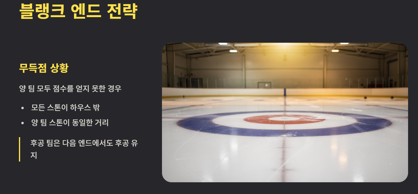 양 팀 모두 점수를 얻지 못하면 ‘블랭크 엔드’가 됩니다. 이 경우 후공 팀은 다음 엔드에서도 후공을 유지합니다.