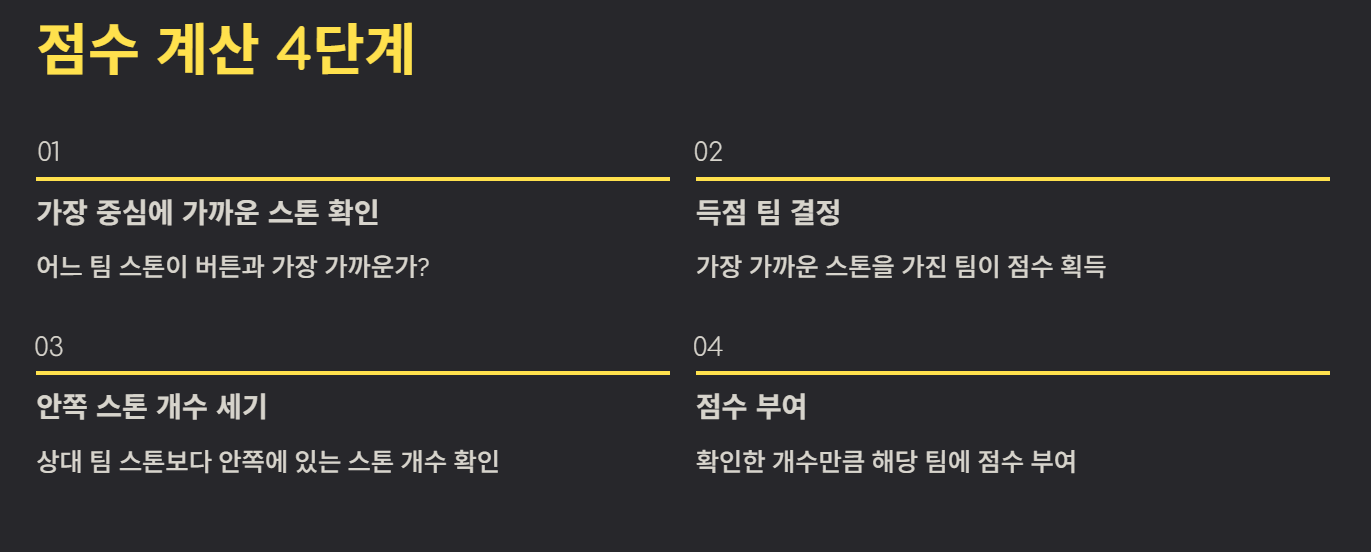 컬링은 한 엔드(End)가 끝날 때마다 점수를 계산합니다. 한 팀이 던진 스톤 중 하우스 중심(버튼)에 가장 가까운 스톤이 있는 팀이 점수를 얻습니다. 상대 팀 스톤보다 더 안쪽에 위치한 스톤 개수만큼 점수가 인정됩니다.