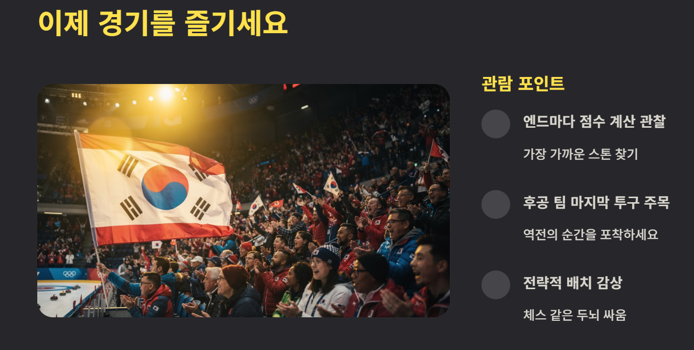 처음에는 규칙이 복잡해 보이지만, 한 번만 이해하면 경기 흐름이 매우 명확해집니다. 특히 마지막 스톤 하나로 점수가 역전되는 장면은 컬링만의 긴장감을 만들어줍니다. 실제 시청자 후기를 보면 “점수 계산 원리를 알고 보니 체스처럼 전략적이라 더 재미있다”는 반응이 많습니다.