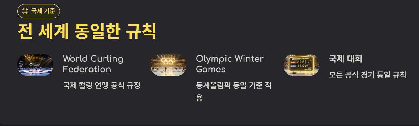 컬링은 국제적으로 동일한 점수 계산 기준을 사용합니다. 대표적으로 World Curling Federation 규정을 따르며, Olympic Winter Games에서도 동일한 방식이 적용됩니다.