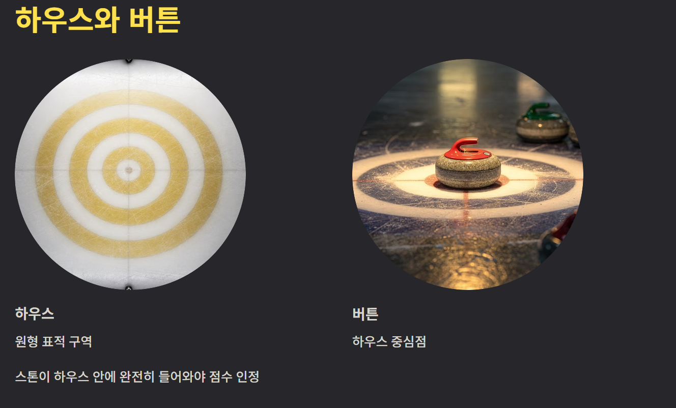 하우스는 원형 표적 구역이며 중심을 버튼이라 부릅니다. 스톤이 하우스 안에 완전히 들어와 있어야 점수 계산 대상이 됩니다. 라인에 걸친 경우 심판 판단이 적용됩니다.