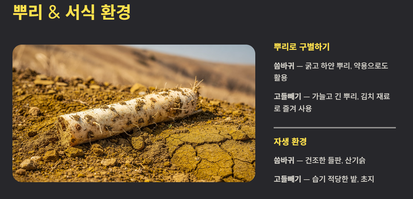 씀바귀는 굵고 하얀 뿌리를 가지고 있으며 약용으로도 활용됩니다. 고들빼기는 뿌리가 가늘고 길며 김치 재료로 많이 쓰입니다. 뿌리의 굵기와 색감도 구별 포인트입니다.