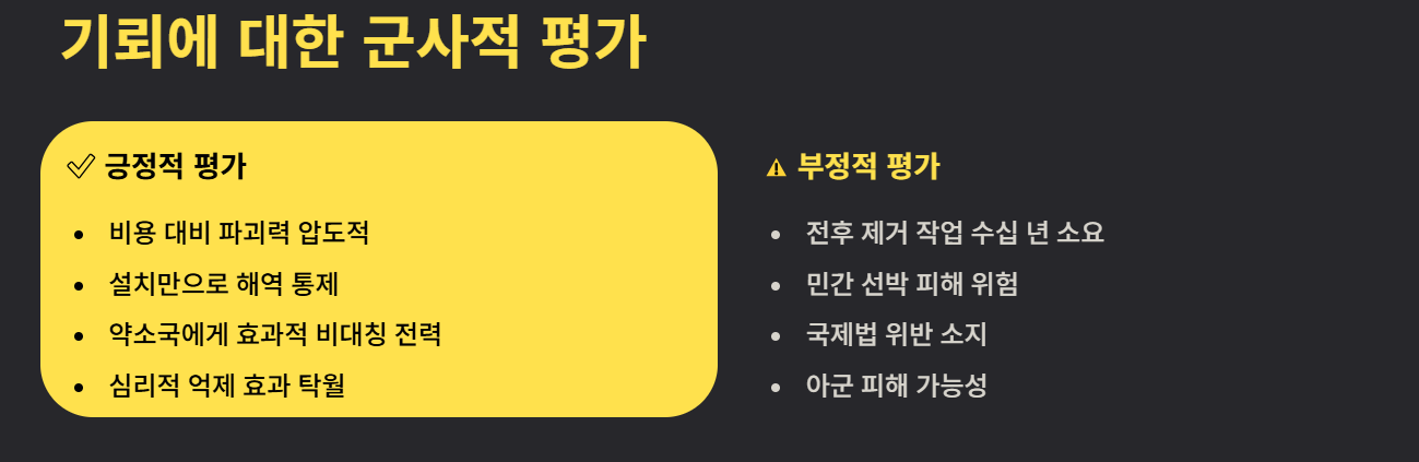 이 때문에 군사 전문가들은 기뢰를 **“가성비 최고의 해군 무기”**라고 부르기도 합니다.