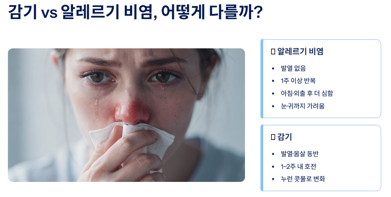 감기와 가장 큰 차이는 발열이 거의 없고, 증상이 1주 이상 반복된다는 점입니다. 특히 아침에 심하고, 외출 후나 청소 후 더 심해진다면 알레르기 비염일 가능성이 큽니다.