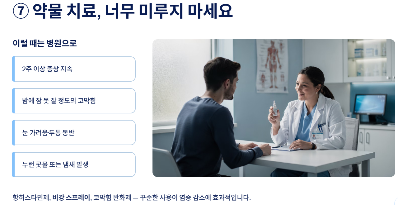 병원에서는 항히스타민제, 비강 스프레이, 코막힘 완화제를 처방하기도 합니다. 특히 비강 스프레이는 꾸준히 사용하면 염증을 줄이는 데 효과적입니다.