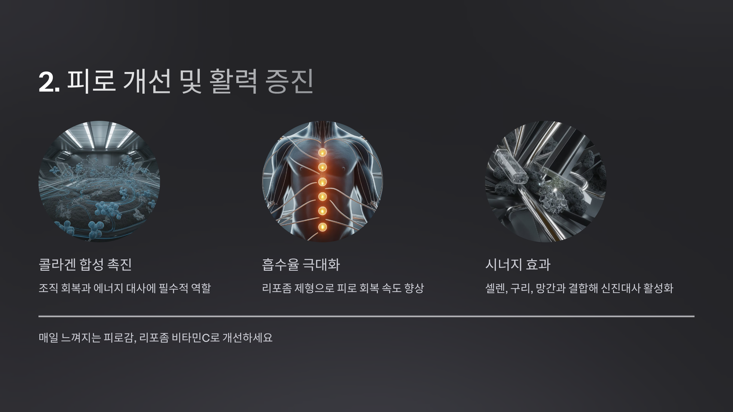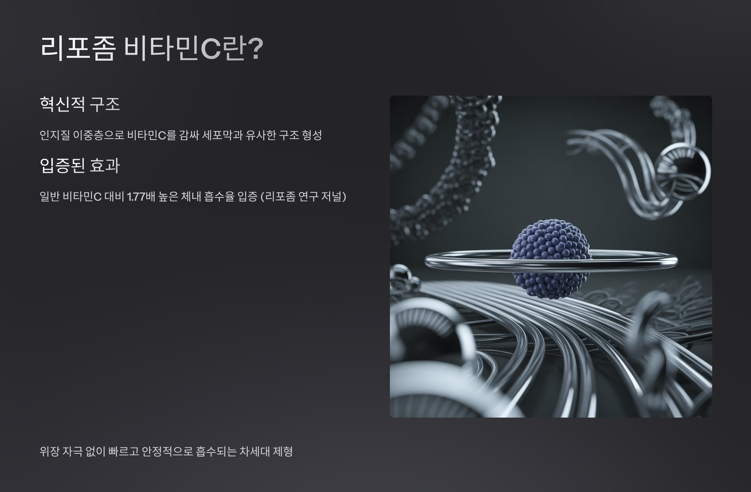 리포좀 비타민C는 낮은 흡수율과 위장 장애**라는 비타민C의 고질적인 문제를 해결한 혁신적인 제품입니다. 만성 피로에 시달리거나, 고용량 비타민C 섭취를 원하지만 속쓰림이 두려웠던 분들에게 최적의 대안이 될 수 있습니다.