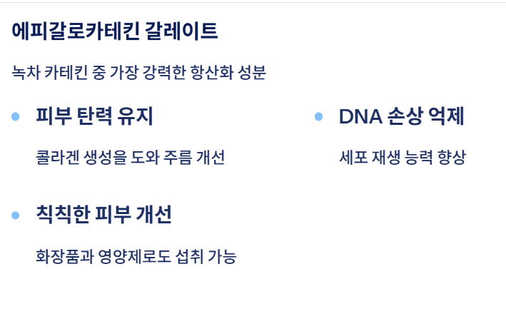 특히 EGCG(Epigallocatechin gallate) 라는 성분은 DNA 손상 억제, 피부 탄력 유지, 주름 개선 등